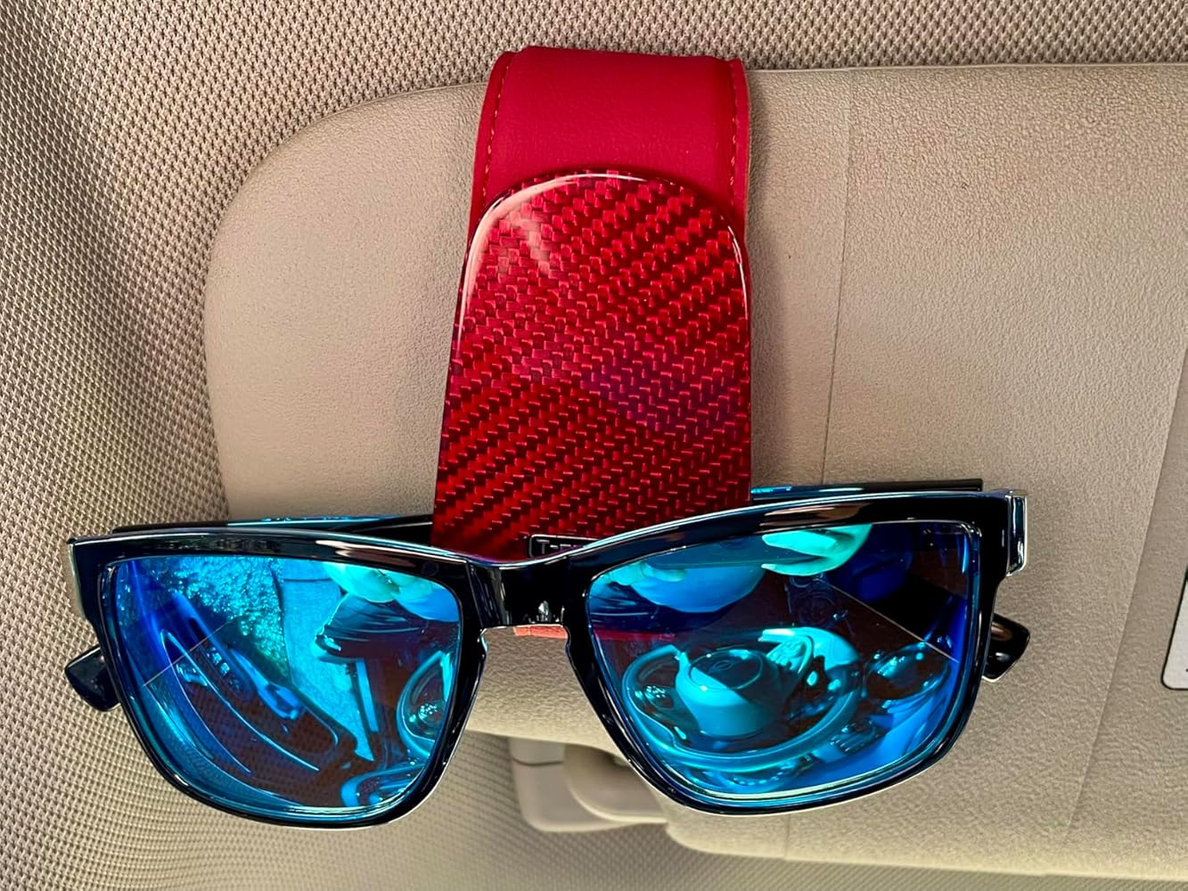 - CARBON FIBER + LEATHER MATERIAL: This sunglass holder is made of leather and carbon fibre, the leather part is soft and not sharp, it won't damage your glasses, the carbon fibre glossy part is low-key and not too luxurious, it's also a high-quality car interior decoration.